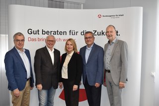 Präsentierten die Jahresbilanz am Ausbildungsmarkt 2024/25 in der Region Bonn/Rhein-Sieg (v. l. n. r.): Ralf Steinhauer, Leiter der Berufsberatung der Agentur für Arbeit Bonn/Rhein-Sieg, Jürgen Hindenberg, Geschäftsführer Berufsbildung und Fachkräftesicherung der IHK Bonn/Rhein-Sieg, Ulrike Pütz, Abteilungsleitung Karrierewerkstatt der HWK Köln, Oliver Krämer, Hauptgeschäftsführer der Kreishandwerkerschaft Bonn/Rhein-Sieg, und Stefan Krause, Vorsitzender der Geschäftsführung der Agentur für Arbeit Bonn/Rhein-Sieg.