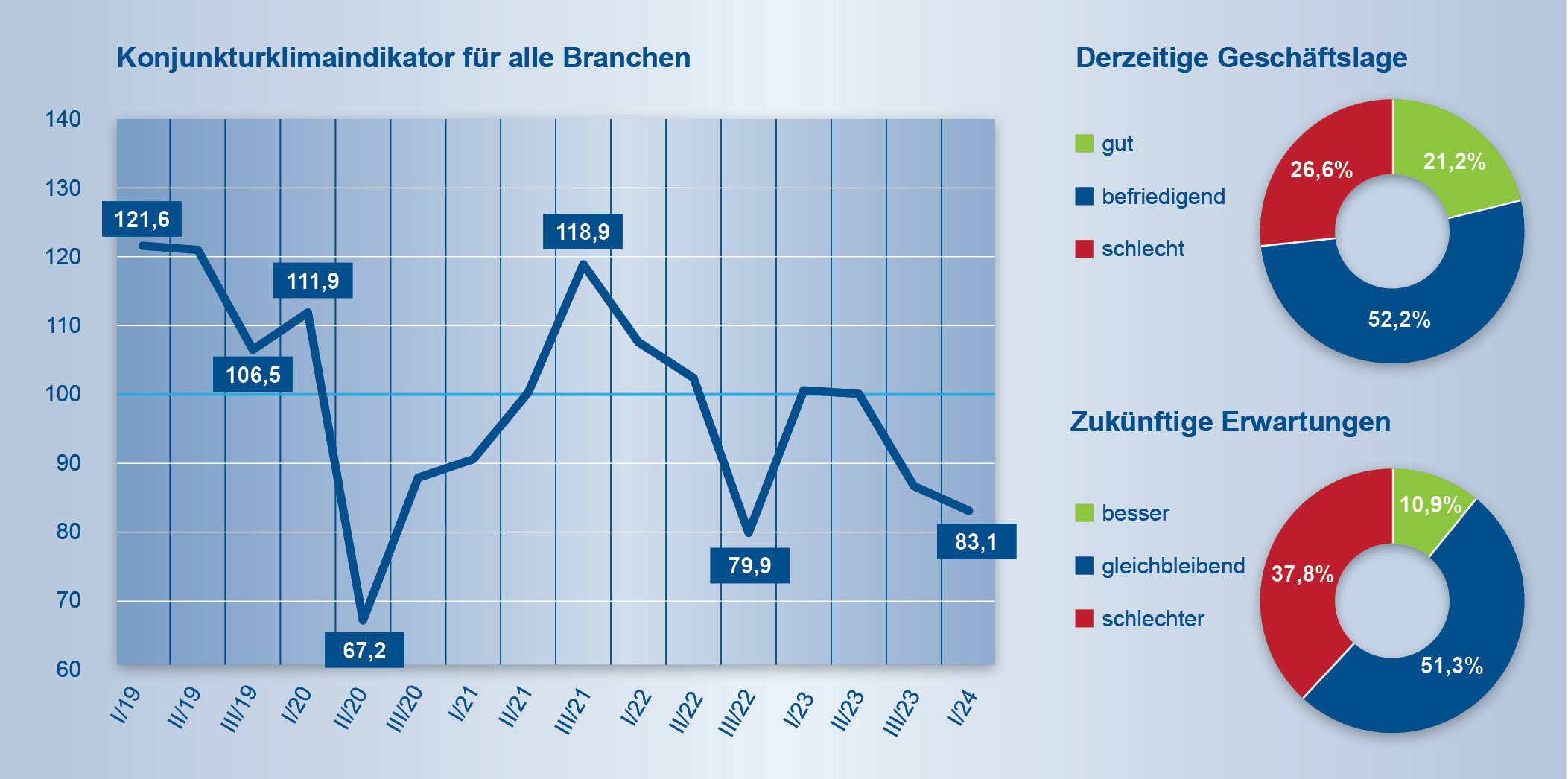 Ihre aktuelle Geschäftslage bezeichnen 21 Prozent der Unternehmen als gut, 27 Prozent als schlecht. Mehr als die Hälfte der Unternehmen sieht das Geschäft gleich von einer Vielzahl von Risiken bedroht: von hohen Energie- und Rohstoffpreisen, den wirtschaftspolitischen Rahmenbedingungen, der schwachen Inlandsnachfrage, steigenden Arbeitskosten und dem Fachkräftemangel.