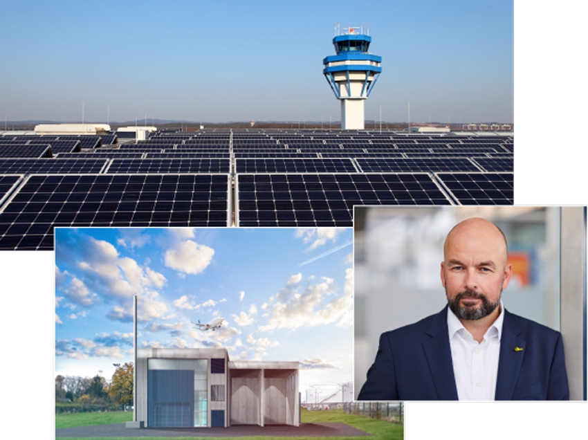 (v.l.) Solaranlage am Konrad Adenauer Airport, der Vorsitzende der Flughafen-Geschäftsführung Thilo Schmid, Visualisierung HolzheizwerkEin noch im Bau befindliches Holzheizwerk soll klimaschonende Wärme mit regenerativem Brennstoff erzeugen. Diese Anlage soll die CO2-Emissionen jährlich um 2700 Tonnen senken. Der nachwachsende Brennstoff fällt bei der Grünpflege teilweise auf dem Flughafengelände an, der fehlende Rest wird lokal zugeliefert. Bei der Fertigstellung 2026 soll die Anlage eine Wärmeleistung von 2,5 Megawatt erreichen.