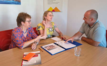 Petra Mellinghoff und Robert Böttcher im Gespräch mit einer KundinAus einem Gespräch mit einer Gründungsberaterin entstand dann der Impuls, sich selbstständig zu machen. Sie startete, von ihrem Wohnzimmer aus, als „mobile Sekretärin“ für Unternehmen, vor allem kleine Handwerksbetriebe. Zusätzlich organisierte sie Computerkurse für Senioren. „Der Bedarf war riesig, die Leute standen Schlange“, erinnert sie sich.